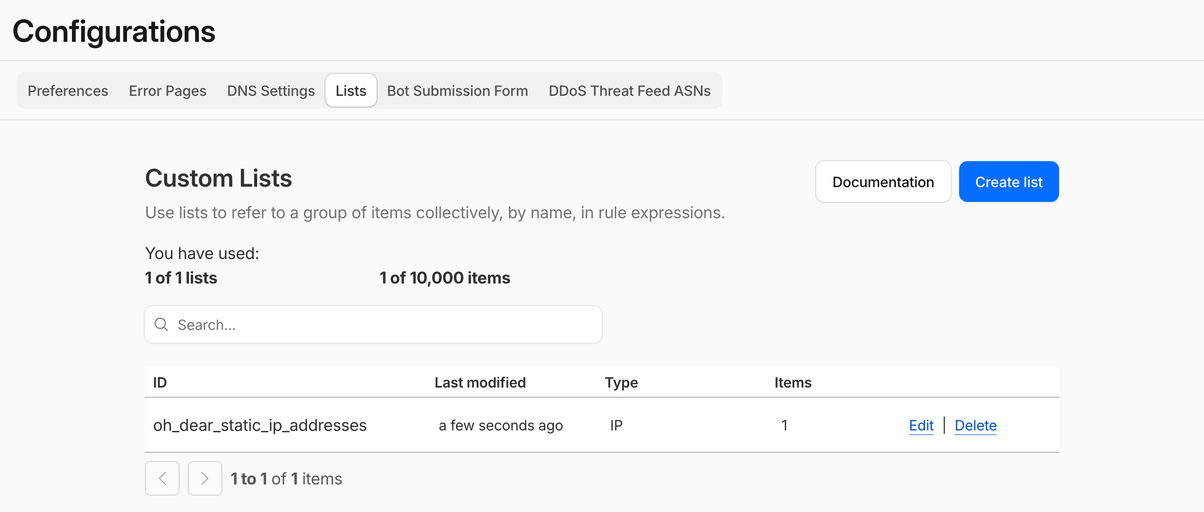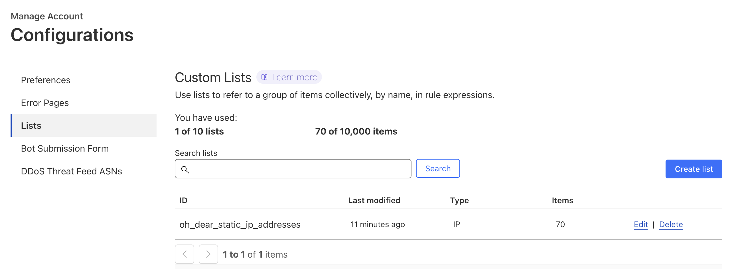 In Cloudflare, you can make lists of objects, including IP addresses. We'll import the Oh Dear static IPs first, so we can use this list later on as a Cloudflare rule.