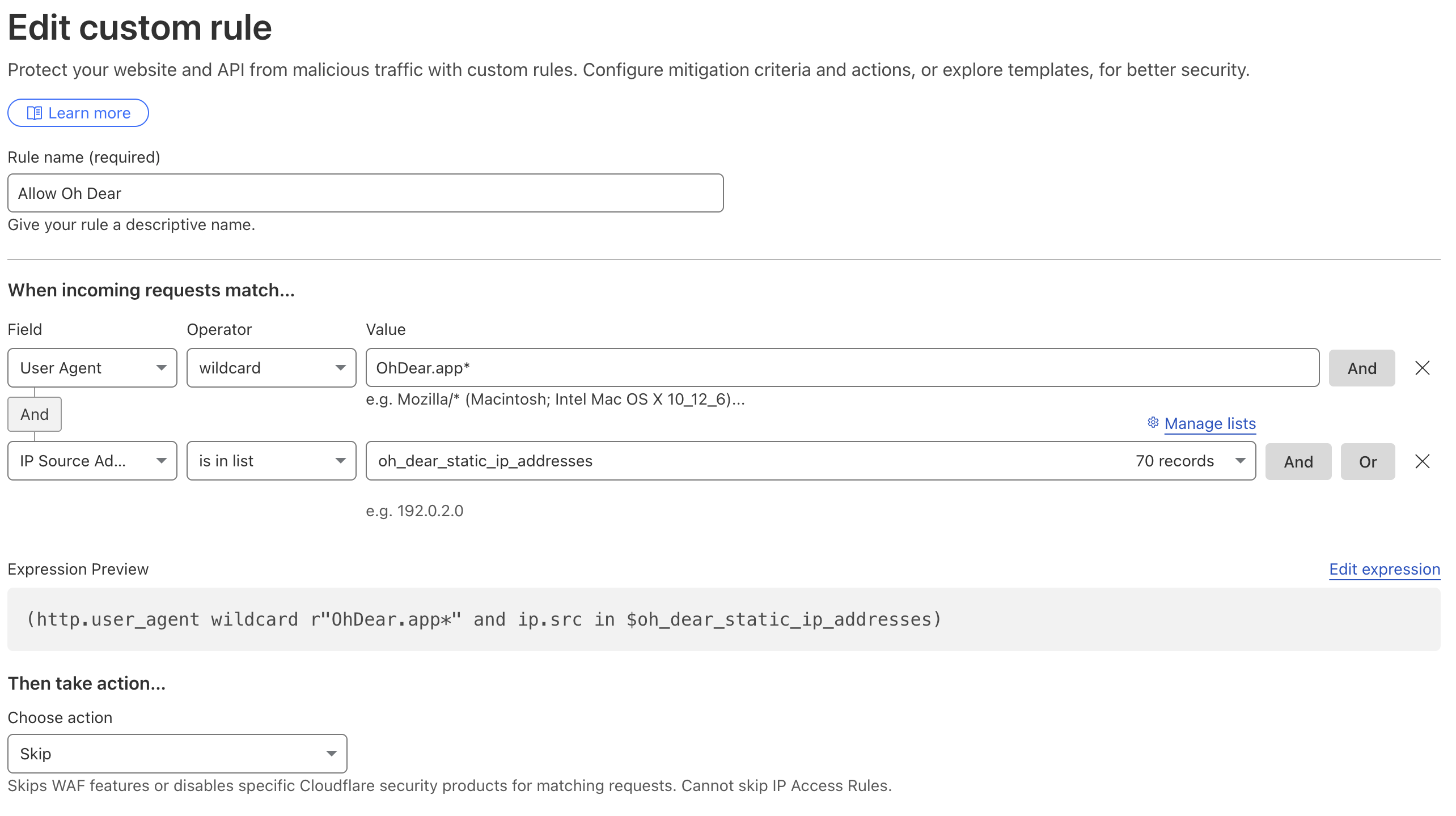After this, Oh Dear should be fully whitelisted on Cloudflare.