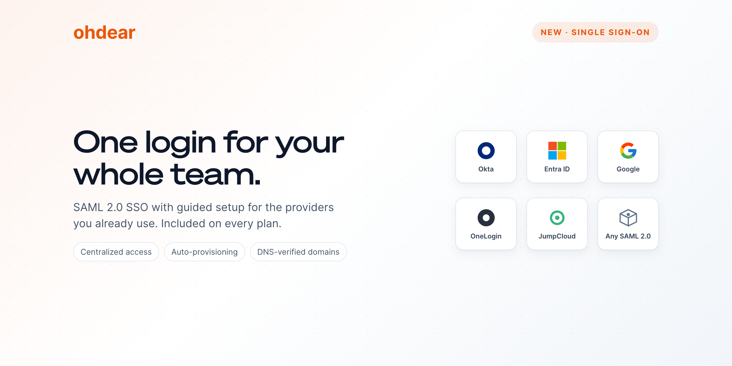 Head to Team Settings > Single Sign-On in the Oh Dear app to verify your domain and connect your IdP. The SSO feature page has the full overview, and the SSO documentation has the step-by-step setup, provider-specific walkthroughs, and the answers to the questions you'll have along the way.