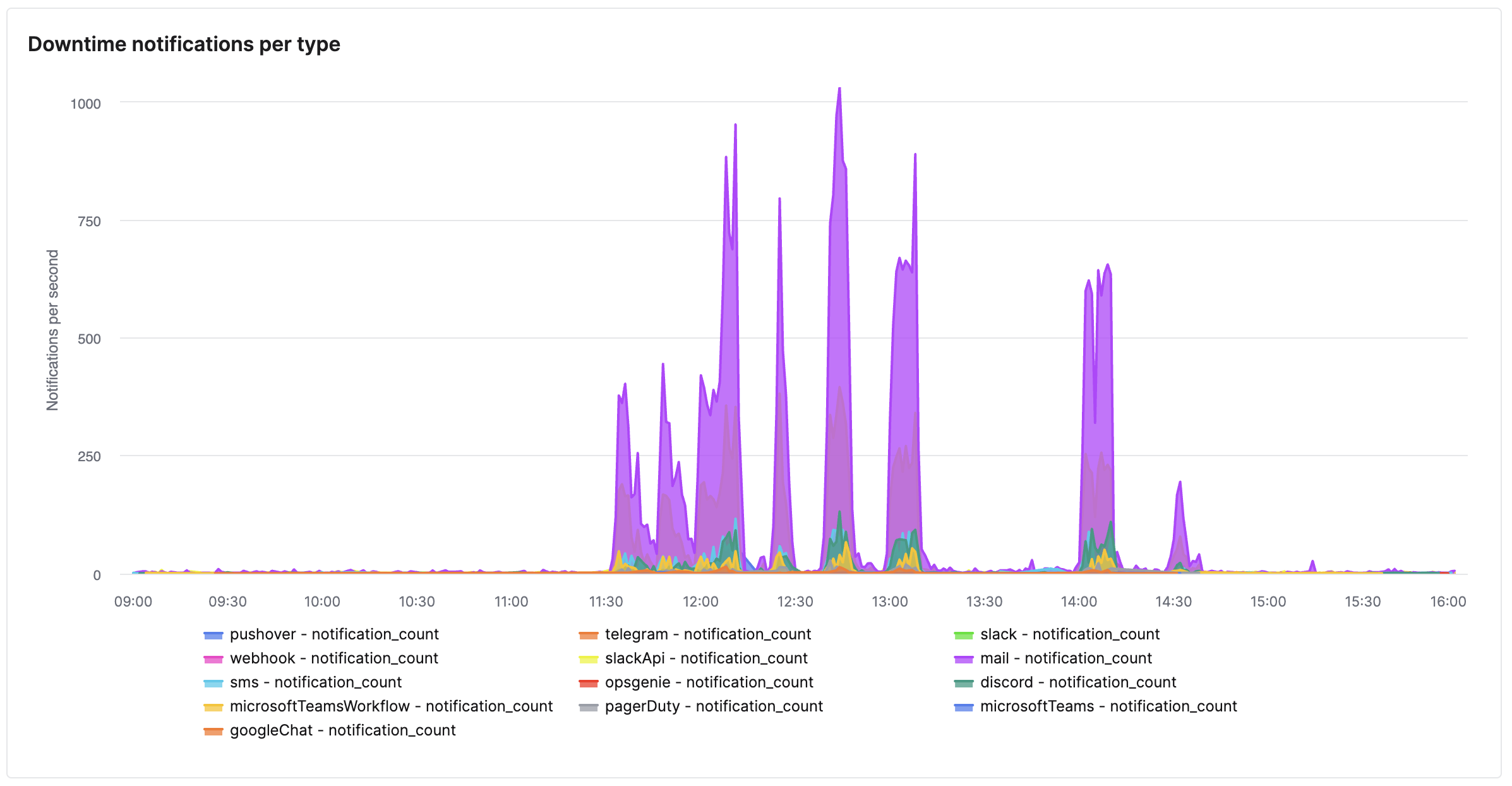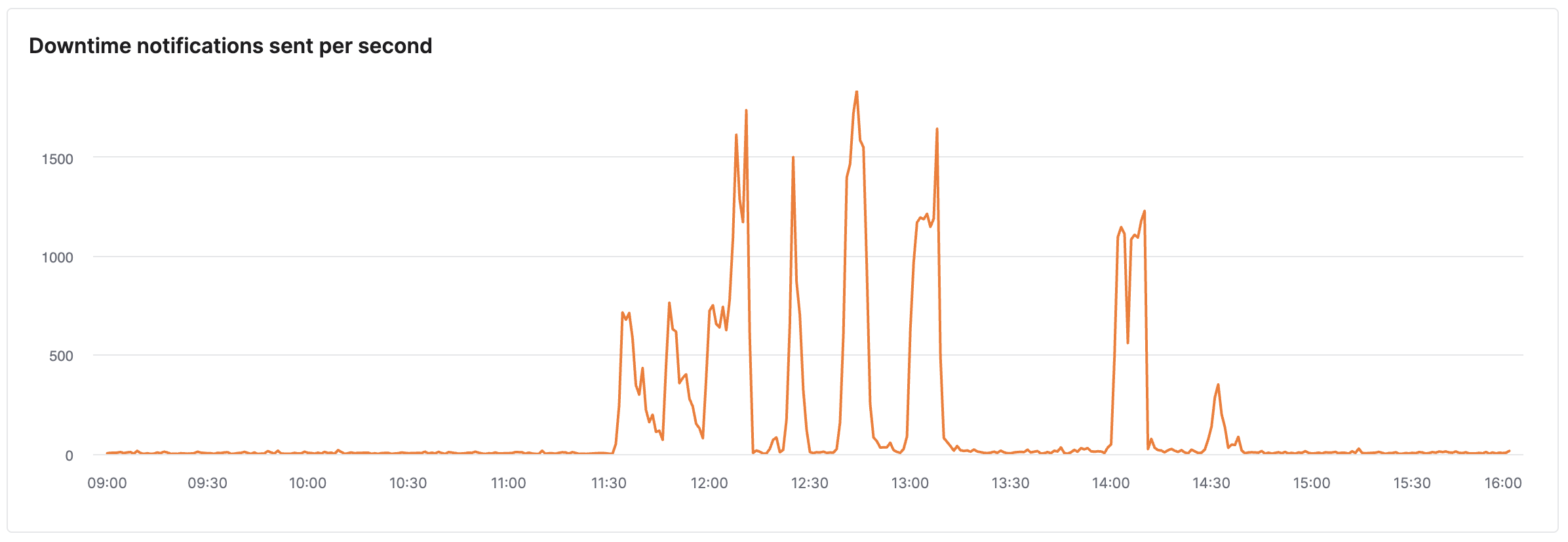 Last night, Cloudflare experienced one of their biggest outages in the past decade. Almost all websites behind Cloudflare's proxy/DDoS-protection service were offline for anywhere between 1–3 hours. That included our own website & application, while our status pages remained online the entire time. This post examines some of our lessons learned, and we'll share our insights into what we saw during the outage. Cloudflare, a net positive for our industry # Let me start by chiming in on the public debate: has the internet decided to centralize too much around a few key players (Cloudflare, AWS, Google, ...)? Probably. Should we now all move away from these big players to decentralize the web again? Probably not. Despite Cloudflare's outage yesterday, I firmly believe they're a net positive for our industry, advancing the protection, speed, and availability of websites globally. Any major provider will experience downtime. I'm confident there will be a solid and transparent post-mortem of this incident with many lessons learned to prevent this from happening again. (Update: Cloudflare's post-mortem on the incident is now available) So no, we won't suddenly move everything away from Cloudflare in a knee-jerk reaction, but we will be conscious to have procedures and workflows readily available to temporarily move away from Cloudflare when there is prolonged downtime. Now, on to the real stuff! Our Web UI was offline, our status pages & monitoring weren't # Oh Dear itself sits behind Cloudflare. We've had the bad luck of experiencing some DDoS attacks a few years ago and have since opted into Cloudflare's Pro plan for better protection against this. As a result, during the outage, this was the availability of our services: Website: ❌ Dashboard: ❌ API: ❌ Monitoring engine: ✅ Notification engine: ✅ Status pages: ✅ The problem we (and our clients) were facing: while status pages were online, our users couldn't post any updates to them because they couldn't log in to the main application that has the interface to manage those status pages. This essentially turned status pages—unless users opted into the auto-updates based on our uptime monitors—into a stale and outdated communication channel. Only when our dashboard services were restored could our users start posting updates. All our actual monitoring & notification engines remained online and performant at all times. Temporarily disabling Cloudflare # Because of this, we temporarily disabled Cloudflare for our website so that our users could access our service again. This turned out to take slightly more time because the Cloudflare Dashboard itself was offline during their outage (because challenges.cloudflare.com, their "I'm not a Robot" service, was offline and prevented logins to their dashboard). Only once the CF dashboard was available again could we disable proxying through Cloudflare. Lesson learned: we need a readily available DNS backup at our domain registry, allowing us to more easily switch nameservers away from Cloudflare to a third party in the case of an emergency. We have backups of our DNS records, but there are many of them, and the process to restore those was still manual and too time-consuming. Our ping endpoint stays behind Cloudflare # Users of our cron job/scheduled task monitoring might have noticed notifications about missed scheduled tasks because the callback URL ping.ohdear.app is also routed through Cloudflare. This was also unavailable during the outage. We do, however, have internal systems that prevented ~99% of the false alerts related to those cron job monitors from being sent. Every 4 seconds, we ping our own endpoint and expect the result to be processed in the following seconds. This system caught the unavailability of the ping endpoint early on and muted most of the alerts for our clients. Only during the recovery/early downtime—when our system hadn't caught this yet—have we sent some notifications to users. Lessons learned: our internal system worked well for this particular use case, but we'll investigate options around service recovery times to ensure we don't send notifications that were just on the edge of the Cloudflare downtime. Increased system load for downtime verifications # The happy path of uptime monitoring is fairly straightforward: make an HTTP (or ping or TCP) request; if the service responds as expected, the service is considered up. All is well. The unhappy path, where we detect downtime, is more resource-intensive: we'll do that exact same monitor request but route it via a different set of servers (technically: a different datacenter provider but within the same geographical continent) and expect that to also confirm the downtime. This means that downtime detection doubles our system load because we can no longer just do a single check to confirm something is up; we need a second verification. We have around 50+ servers worldwide, here's a screenshot of the network-throughput of one of our satellite servers: In our capacity planning, we take this into account: our systems aren't running at their limits and always have the capacity to double their throughput at any moment in time, especially for these circumstances. Lessons learned: there's a reason we keep 50% spare capacity at all times—this incident shows why. We'll keep doing so. A spike in notifications sent # It makes sense that when Cloudflare goes down, we'll start notifying a lot of our users that their website is down. Yesterday can be considered a stress test on our own systems as well, and I'm glad to see our choices in architecture have ensured that this was a smooth process. At any given time, some of the websites we monitor are down, and we'll be notifying those users. Yesterday was a bit different, though. For any of the following data, timestamps are shown in UTC. At the peak, we were sending ~1,500 notifications per second. This is a mix of channels—some via email, some Slack, some Discord, etc.